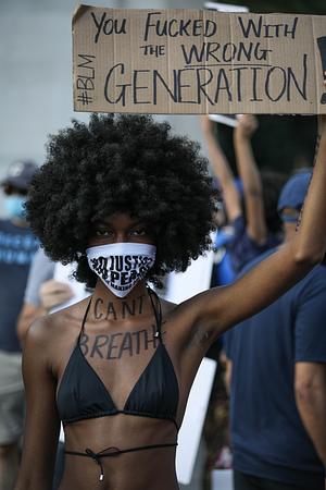 Sandra Mabelle holds a BLM sign during a 2020 Black Lives Matter protest.
